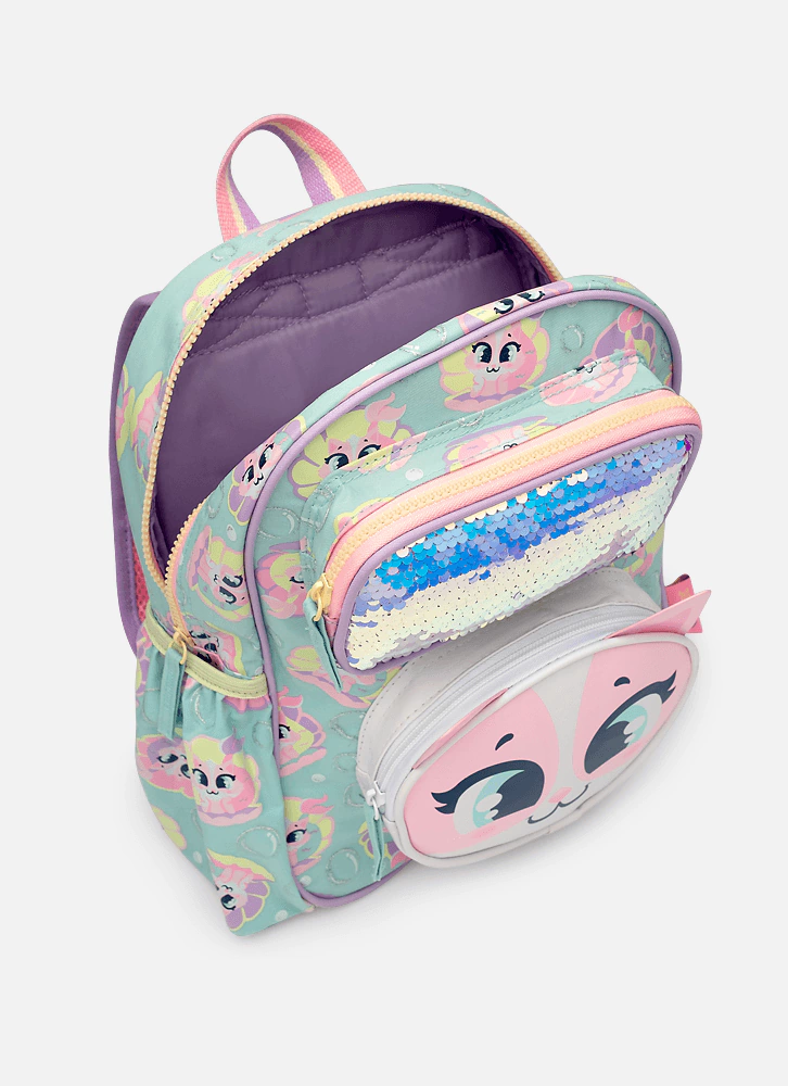 Mochila pequena em nylon com estampa corrida de gata, bolso frontal com formato de gata em PU fosco com aplique de orelinhas, bolso frontal pequeno com paetê reversível. Possui bolsinho lateral para garrafinha.